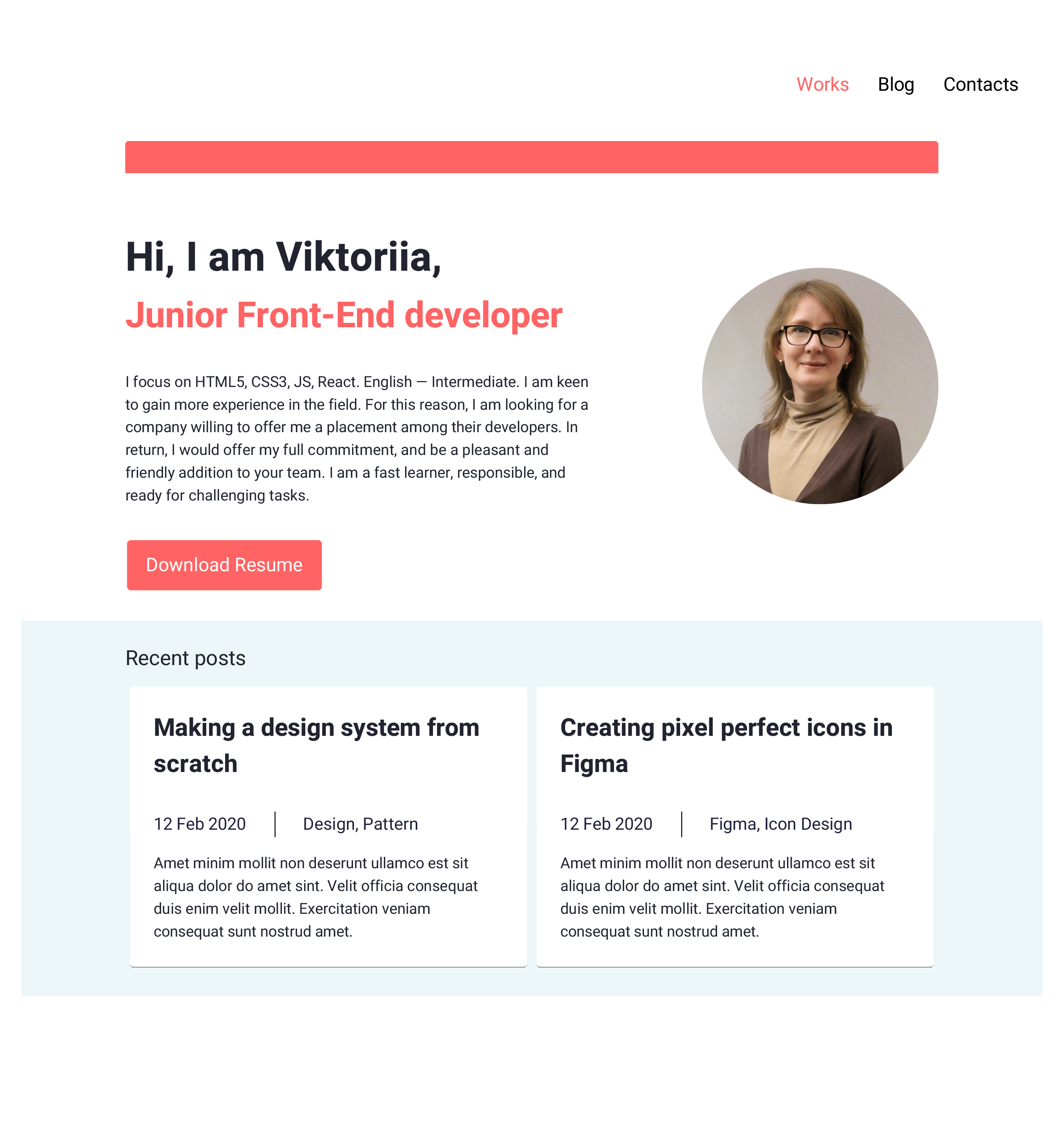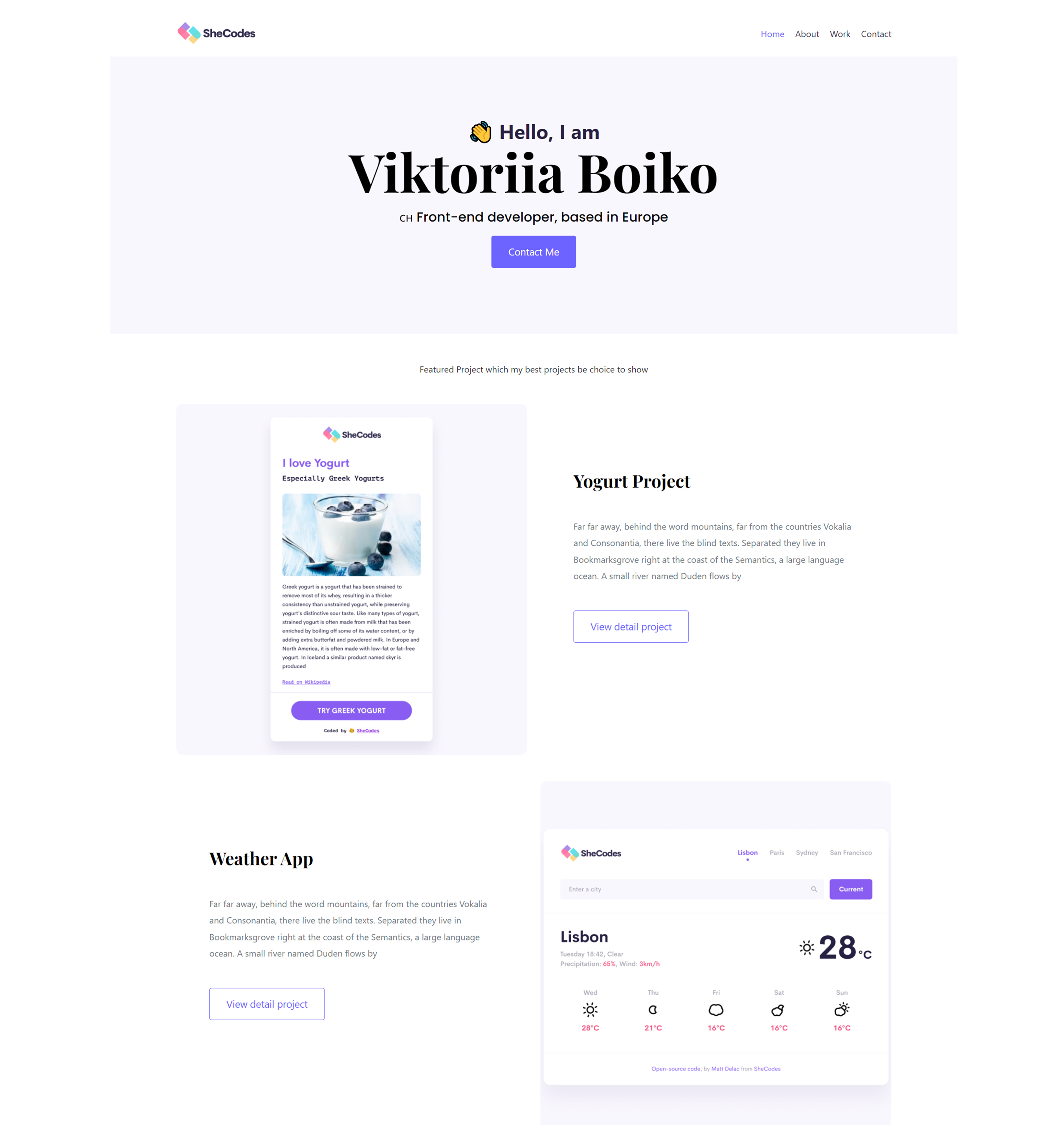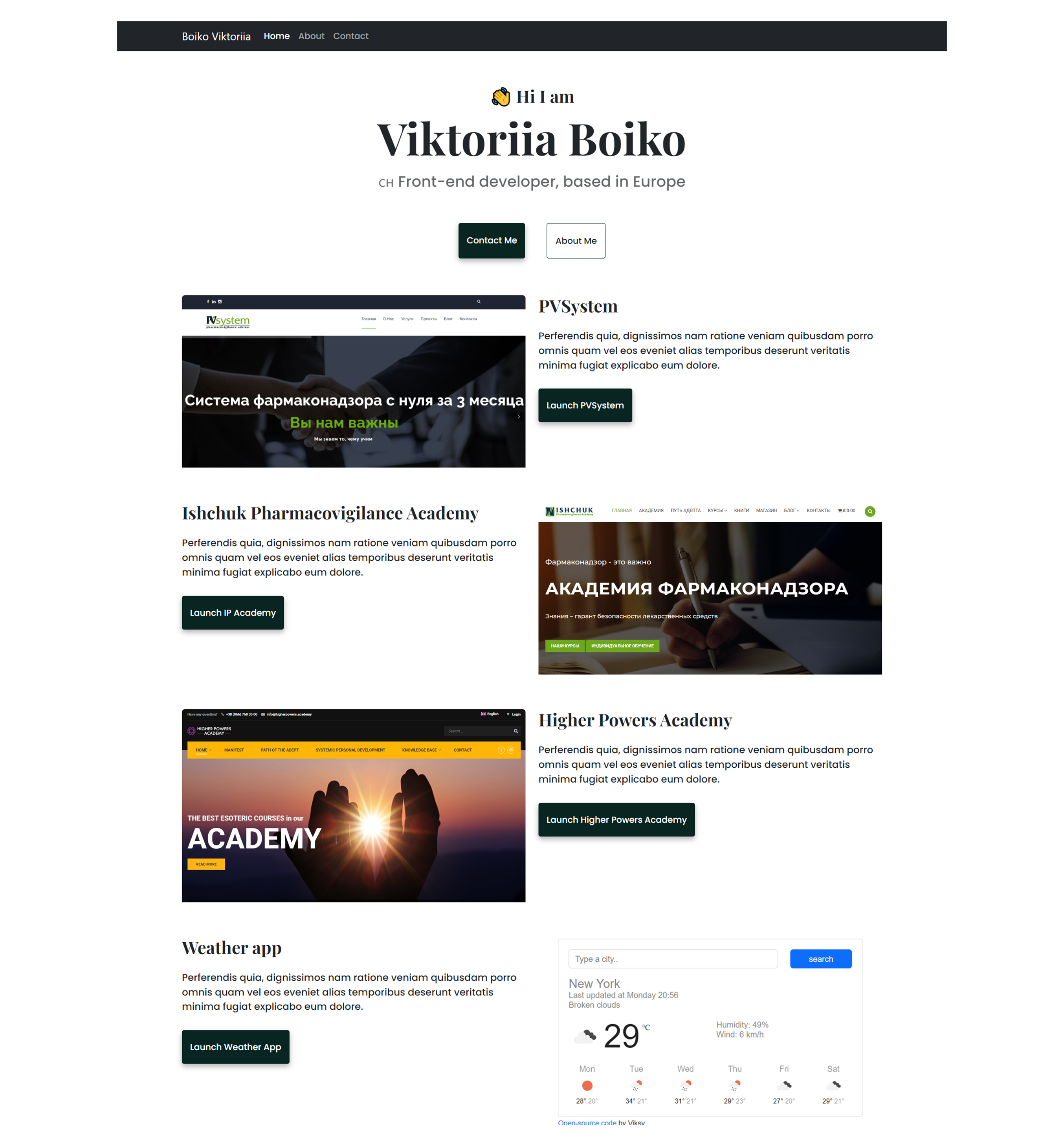 Basically I've been working on landing page (HTML,CSS), multiple-pages website (HTML, CSS, JavaScript, Bootstrap, Flexbox&Grid), Portfolio (HTML, CSS), Vanilla Javascript Weather Application (HTML ,CSS, JS, Bootstrap, API, Git and GitHub), Dictionary App (HTML, CSS, JavaScript, React). Also I have a few pet-projects on my Github.